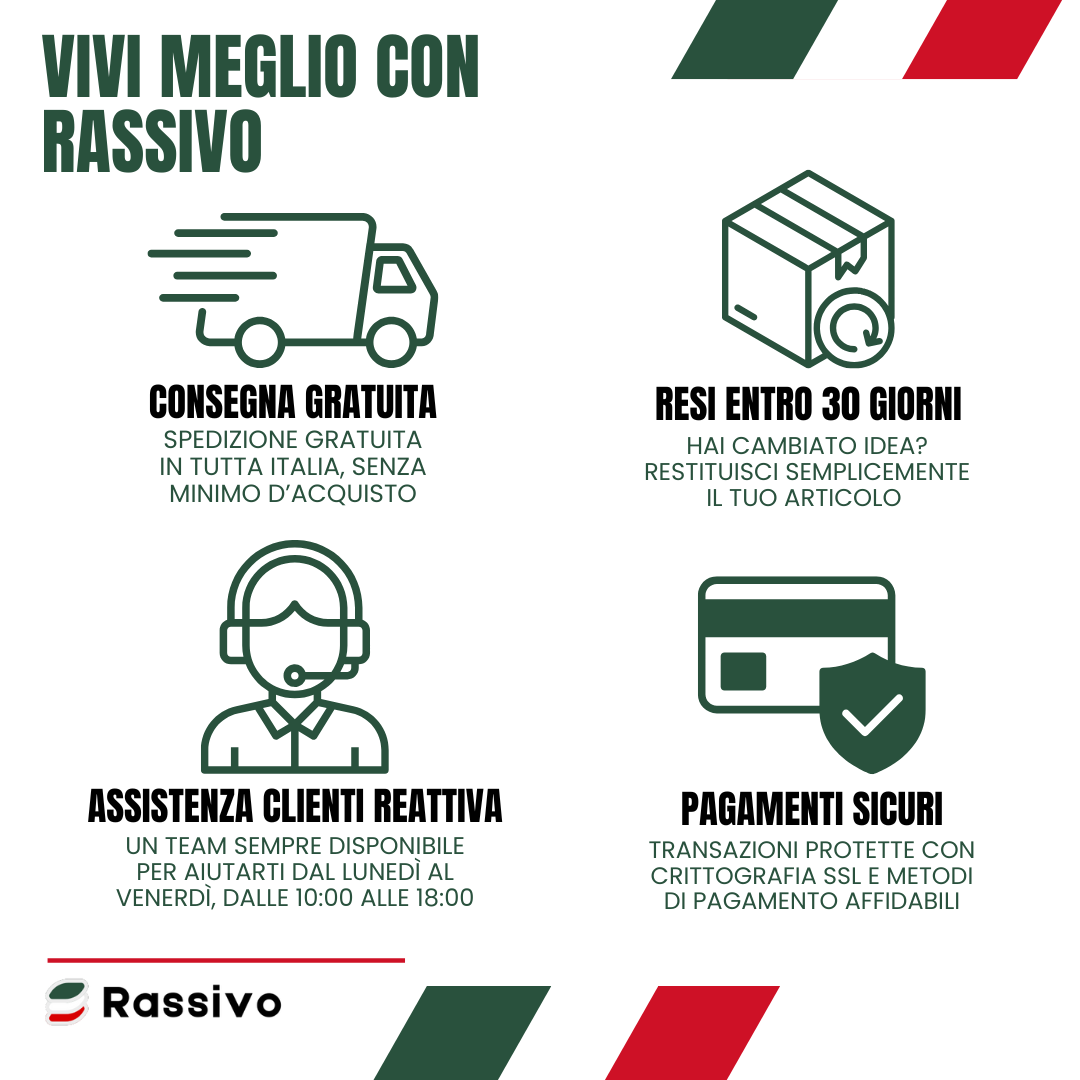 Da Rassivo, la soddisfazione dei nostri clienti è la nostra priorità. Goditi un acquisto rapido e sicuro, con un servizio clienti sempre disponibile per rispondere alle tue domande e offrire soluzioni immediate in caso di necessità. Inoltre, offriamo resi e cambi facili entro 30 giorni. Con Rassivo, acquisti in tutta tranquillità.