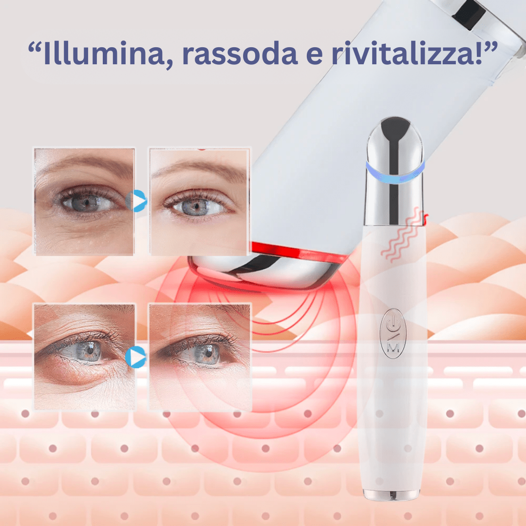 Il Massaggiatore Oculare Anti-Rughe e Anti-Luce Blu è progettato con un approccio all’avanguardia che combina fototerapia, massaggio vibrante e disinfezione.